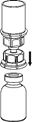 4. Die Produktflasche auf eine feste Unterlage stellen. Die Lösungsmittelflasche mit dem aufgesetzten «Mix2Vial» Set herumdrehen und den Dorn des transparenten Adapters senkrecht in den Stopfen der Produktflasche einstechen. Das Lösungsmittel läuft automatisch in die Produktflasche über.