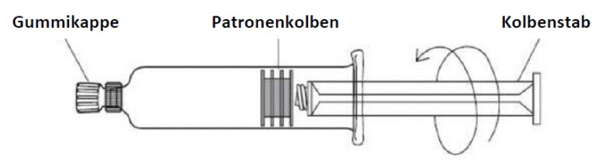 1. Drehen Sie die Kolbenstange im Uhrzeigersinn, um das Gewindeende in den Kolben einzuschrauben, und schieben Sie sie einige Millimeter nach vorne, um jegliche Reibung zwischen dem Kolben und dem Glaszylinder der Spritze zu beseitigen.