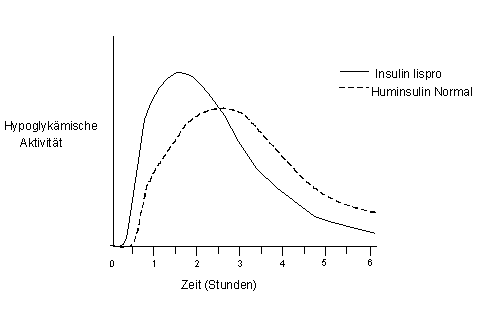 Insulin Lispro hat einen raschen Wirkungseintritt (ca. 15 Minuten), was eine zeitlich nähere Applikation in Bezug auf die Mahlzeit erlaubt (innerhalb von 15 Minuten vor oder nach der Mahlzeit) als bei Normalinsulin (30 - 45 Minuten vor der Mahlzeit).