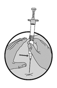 2.Halten Sie die Spritze senkrecht nach oben und setzen Sie das Verdünnungsmittel frei, indem Sie den Kolben langsam schieben, bis der erste Stopfen die blaue Linie in der Mitte des Zylinders erreicht hat.
