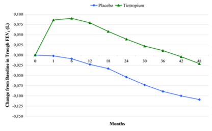 In einer 4-Jahresstudie unter Beteiligung von 5993 Patienten konnte Spiriva die jährliche Rate des FEV1 Abfalls (primärer Endpunkt) nicht verändern. Die Studie zeigte aber betreffend verschiedener sekundärer Endpunkte Vorteile für Spiriva. So liess sich der Effekt unter Zusatzbehandlung mit Spiriva, der sich in einer Verbesserung der FEV1-Werte bei Therapiebeginn zeigte, während der gesamten Studiendauer beibehalten.