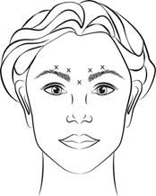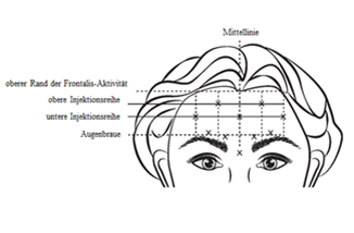 Die Stellen der folgenden horizontalen Injektionsreihen sollten durch leichtes Tasten an der Stirn im Ruhezustand und bei maximalem Anheben der Augenbrauen bestimmt werden: