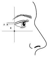 -Untere Injektionsreihe: In der Mitte zwischen dem oberen Rand der Frontalis-Aktivität und der Augenbraue, aber mindestens 2 cm oberhalb der Augenbraue