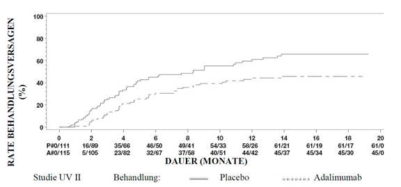 Eine Sensitivitätsanalyse des primären Endpunktes, in welcher Patienten, die vorzeitig abbrachen und solche, die unerlaubterweise Kortikosteroide als Begleitmedikation nahmen, als Behandlungsversager gezählt wurden, zeigte einen starken Behandlungseffekt zugunsten von Humira (UV I: HR=0.66, 95%CI 0.48 – 0.88, p=0.005; UV II: HR=0.59, 95%CI 0.42-0.81, p=0.001).