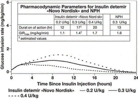 Die Wirkdauer von Levemir beträgt in Abhängigkeit der Dosis bis zu 24 Stunden. Daraus ergibt sich eine 1× oder 2× tägliche Verabreichung. Bei einer 2× täglichen Verabreichung stellt sich der Steady State nach Verabreichung von 2–3 Dosen ein. Bei einer Dosis von 0,2–0,4 E/kg tritt nach 3–4 Stunden mehr als 50% der Wirkung ein, die bis zu ca. 14 Stunden andauert.