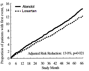 Der primäre Endpunkt war die Kombination von kardiovaskulärer Morbidität und Mortalität gemessen als Reduktion der kombinierten Ereignisse kardiovaskulärer Tod, Schlaganfall und Myokardinfarkt. Die Ergebnisse zeigten, dass die Behandlung mit Losartan im Vergleich zu Atenolol zu einer Risikoreduktion von 13% (p=0,021) in Bezug auf den primären zusammengesetzten Endpunkt führte (siehe Graphik 1).