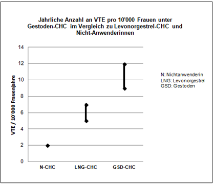 Aufgrund der vorliegenden epidemiologischen Daten wird geschätzt, dass im Verlauf eines Jahres 9-12 von 10'000 Frauen, die ein Gestoden-haltiges CHC anwenden, eine VTE erleiden; im Vergleich hierzu kommt es pro Jahr bei 5-7 von 10'000 Frauen, die ein Levonorgestrel-haltiges CHC anwenden, zu einer VTE.