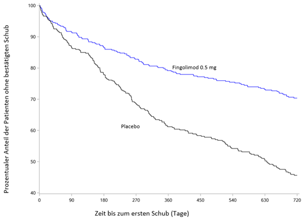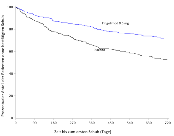 In Monat 12 der Verlängerungsstudie hatte sich bei den Patienten, die in der Hauptstudie Interferon beta-1a i.m. erhalten hatten und dann auf 0.5 mg Fingolimod umgestellt wurden, die ARR relativ um 30% reduziert (ARR-Verhältnis=0.70, p=0.06). Bei Patienten, die bereits in der Hauptstudie mit 0.5 mg Fingolimod behandelt worden waren, blieb die ARR über die Haupt- und Verlängerungsphase hinweg niedrig (ARR=0.18 bis Monat 24).