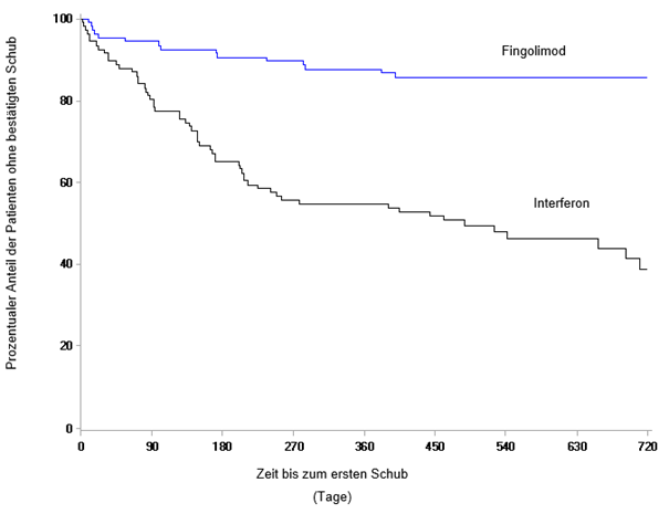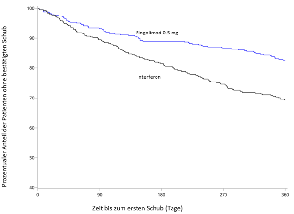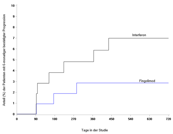 Der primäre Endpunkt, die auf das Jahr umgerechnete Schubrate (Annualized Relapse Rate, ARR) war bei den Patienten, die mit Fingolimod behandelt wurden, statistisch signifikant niedriger als bei denen, die Interferon beta-1a erhielten (relative Reduktion der ARR um 81.9%). Der wichtigste sekundäre Endpunkt, die auf das Jahr umgerechnete Anzahl der neu aufgetretenen bzw. neu vergrösserten T2-Läsionen bis Monat 24, war ausserdem bei den Patienten, die mit Fingolimod behandelt wurden, statistisch signifikant niedriger als bei denen, die Interferon beta-1a erhielten, ebenso wie die Anzahl der vorhandenen Gd-anreichernden T1-Läsionen pro Scan bis Monat 24. Durch Fingolimod wurde zudem die auf das Jahr umgerechnete Hirnatrophie- Rate von der Baseline bis Monat 24 statistisch signifikant reduziert. Eine zusätzliche Post-hoc-Analyse zeigte, dass durch Fingolimod im Vergleich mit Interferon beta-1a der Zeitraum bis zum Einsetzen einer 3-monatigen bestätigten Progression der Behinderung statistisch signifikant verlängert wurde. Die Ergebnisse dieser Studie sind in Tabelle 5, Abbildung 4 und Abbildung 5 dargestellt.