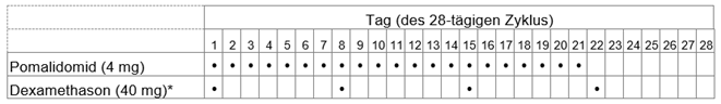 Pomalidomid 4 mg wurde bis zur Progredienz, entweder allein an 21/28 Tagen verabreicht oder in Kombination mit Dexamethason (40 mg wöchentlich, verabreicht an den Tagen 1, 8, 15 und 22 eines jeden 28-tägigen Zyklus).