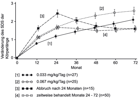 Die Abbildung zeigt, dass die kontinuierliche Behandlung über 72 Monate wirksam und dosisabhängig ist. Bei Patienten, die nur während der ersten 24 Monate behandelt wurden, sank der Standard-Deviation-Score (SDS) der Körperlänge zwischen 24 und 72 Monaten wieder ab. Bei Patienten, die nach 24 Monaten nur zeitweise behandelt wurden, blieb der Standard-Deviation-Score (SDS) der Körperlänge mehr oder weniger unverändert. Ein Abbruch der Behandlung führte zu einem Verlust des Wachstumsvorteils.
