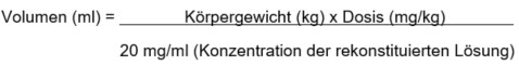 Nach Rekonstitution mit 5 ml bzw. 8 ml Wasser für Injektionszwecke beträgt die Konzentration 20 mg/ml.