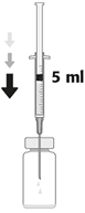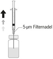 5. Auf eine sterile 1 ml Spritze eine sterile 5-Micrometer Filternadel stecken (die Filternadel kann in der Faltschachtel vorhanden sein). Diese Spritze vertikal durch die Mitte des Stopfens der Durchstechflasche stechen und dabei die Durchstechflasche in einer aufrechten Position halten.