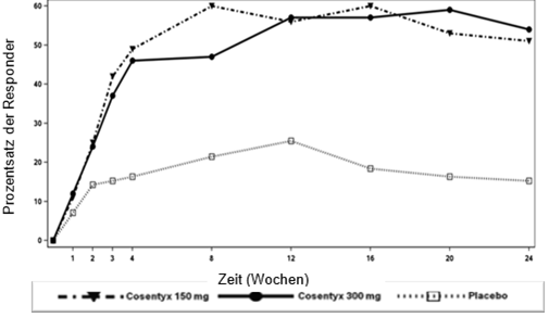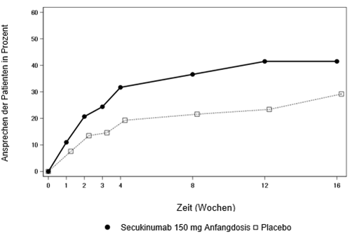 In beiden Studien setzte die Wirkung von Secukinumab bereits in Woche 2 ein, die Wirksamkeit nahm bis Woche 16 zu und hielt bis Woche 52 an.