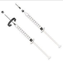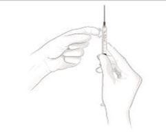 2.Ziehen Sie etwas mehr als 1.0 ml steriles Wasser für Injektionszwecke (SWFI) in eine graduierte 1-ml-Einwegspritze auf und adjustieren Sie das Volumen auf 1.0 ml.
