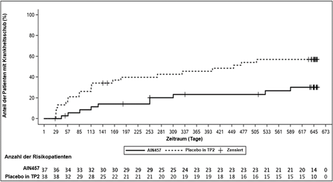 Bei Absetzen der Therapie bei Patienten, die primär angesprochen haben, ist das Risiko des Aufflammens der Psoriasis zu berücksichtigen. In einer Extensionsstudie mit Patienten, die primär angesprochen haben, wurde ein Aufflammen der Psoriasis sowohl nach Absetzen von 150 mg als auch 300 mg beobachtet: Bis 8 Wochen nach Absetzen der Therapie wurde bei 4% der mit 300 mg behandelten Patienten und 4.7% der mit 150 mg behandelten Patienten ein Aufflammen beobachtet. Aufflammen in Form einer Pustulären Psoriasis betraf 1.1% bzw. 0.7% der vorher mit 300 mg bzw. 150 mg behandelten Patienten.