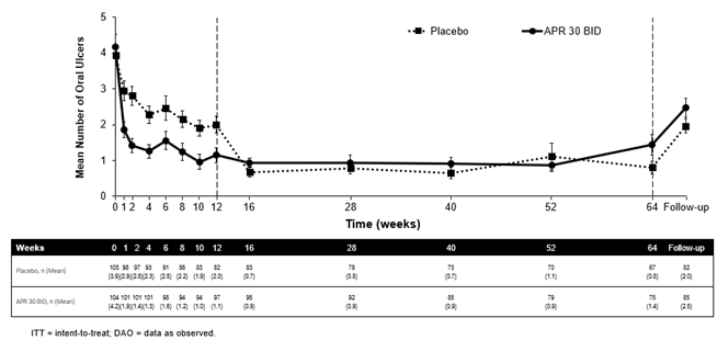Der primäre Endpunkt war die Fläche unter der Kurve (AUC) für die Anzahl der oralen Ulcera von der Baseline bis einschliesslich Woche 12. Die sekundären Endpunkte umfassten andere Parameter für orale Ulcera (Schmerzen durch orale Ulcera auf einer visuellen Analogskala (VAS)), Anteil von ulkusfreien Patienten (vollständiges Ansprechen), Zeit bis zum Beginn der Rückbildung oraler Ulcera und Anteil derPatienten, die eine Rückbildung von oralen Ulcera bis Woche 6 erreichten und über mindestens 6 weitere Wochen während der 12-wöchigen placebokontrollierten Behandlungsphase bei jedem Besuchstermin ulkusfrei blieben.