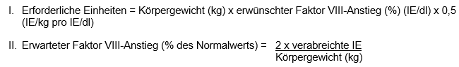 Die Berechnung der erforderlichen Faktor VIII-Dosis basiert auf dem empirischen Ergebnis, dass eine Internationale Einheit (IE) Faktor VIII pro kg Körpergewicht die Faktor VIII-Aktivität im Plasma im Durchschnitt um 2% der normalen Aktivität oder 2 IE/dl erhöht. Die erforderliche Dosis wird anhand der folgenden Formel ermittelt: