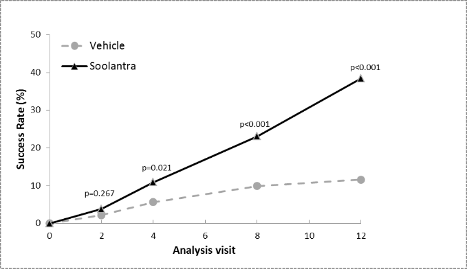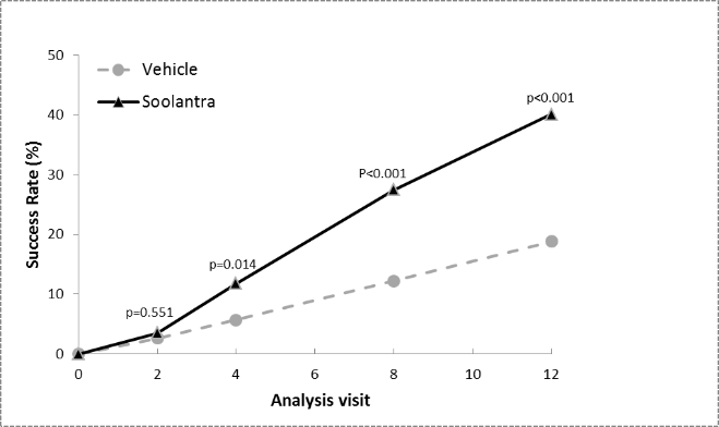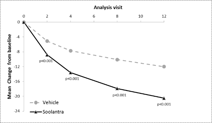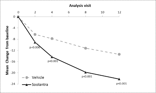 In beiden Studien war Soolantra in beiden Co-Primärendpunkten der Vehikel-Crème statistisch signifikant überlegen (p<0,001, siehe Tabelle 4 sowie Abbildung 1, Abbildung 2, Abbildung 3 und Abbildung 4), wobei die Wirkung bereits nach 4-wöchiger Behandlung einsetzte.