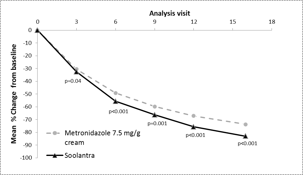 Nach 16 Behandlungswochen war Soolantra statistisch signifikant wirksamer als die 7,5 mg/g Metronidazol-Creme (p<0.001), mit einer Reduktion der Läsionen um 83,0 % bzw. 73,7 % gegenüber Baseline in der Ivermectin- bzw. Metronidazolgruppe (siehe Abbildung 5). Die Befunde für die Sekundärendpunkte IGA-Wertung und absolute Änderung der Anzahl entzündlicher Läsionen in Woche 16 bestätigten die Überlegenheit von Soolantra (p<0.001).