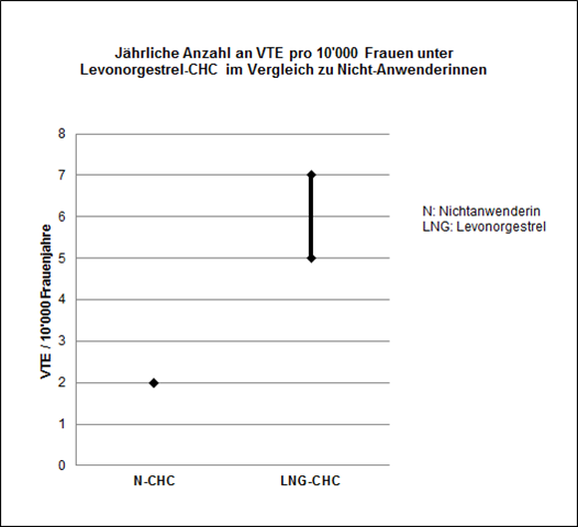Die Anwendung jedes CHC erhöht das Risiko für VTE im Vergleich zur Nichtanwendung. Arzneimittel, die Levonorgestrel, Norgestimat oder Norethisteron enthalten, sind mit dem geringsten Risiko für eine VTE verbunden.