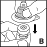 4.Stellen Sie die Flasche auf eine feste, rutschsichere Unterlage. Ziehen Sie die Papierfolie von der Verpackung des Adapters, aber nehmen Sie den Adapter nicht aus der Verpackung. Halten Sie die Verpackung des Adapters fest, platzieren Sie diese über die Durchstechflasche mit Pulver und drücken sie den Adapter fest auf die Flasche (B). Der Flaschenadapter rastet über der Flaschenkappe ein. Entfernen Sie zu diesem Zeitpunkt noch nicht die Verpackung des Adapters.