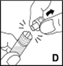 6.Halten Sie den Spritzenzylinder fest und entfernen Sie die Spritzenkappe von der Spitze (D). Berühren Sie die Spitze der Spritze nicht mit Ihrer Hand oder irgendeiner Oberfläche. Legen Sie die Spritze zur späteren Benutzung zur Seite.