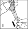 11.Halten Sie die Flasche mit Adapter und Spritze nach oben (I) und füllen Sie die Spritze durch langsamen, gleichmässigen Zug des Kolbens. Stellen Sie sicher, dass der gesamte Inhalt der Flasche in die Spritze überführt wurde. Entlüften Sie die Spritze.