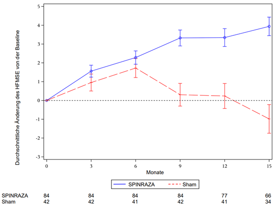 Hinweis: Anzahl Patienten in der ITT, welche jeden Besuch wahrgenommen haben: Monate 3, 6, 9 (Spinraza n = 84, Sham-Kontrolle n = 42), Monat 12 (Spinraza n = 77, Sham-Kontrolle n = 41), Monat 15 (Spinraza n = 66, Sham-Kontrolle n = 34).