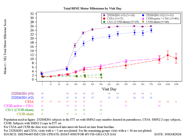 Studie CS7 ist eine zweiteilige Phase 2 Studie, bei der Teil 1 als randomisierte, doppelblinde und Sham kontrollierte und Teil 2 als Open-Label-Erweiterung durchgeführt wurde. In die Studie wurden symptomatische Patienten mit einer infantilen Form der SMA bei Säuglingen (≤6 Monate) oder später auftretender SMA (> 6 Monate) mit 2 oder 3 Kopien von SMN2, die aufgrund des Screening-Alters, des Screening-Verfahrens oder der SMN2-Kopienzahl nicht für eine Teilnahme an den Studien CS3B oder CS4 geeignet waren, eingeschlossen. Die Patienten wurden im Teil 1 der Studie über einen medianen Zeitraum von 302 Tagen beobachtet.
