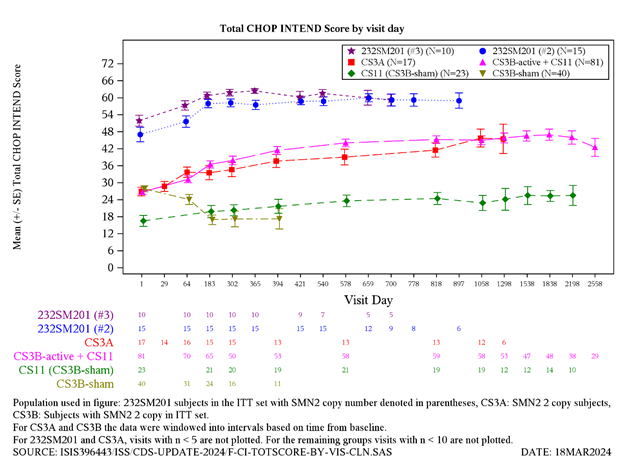 Abbildung 3: CHOP INTEND Score versus Studientage für die Studien CS3B (Spinraza und Sham-Kontrolle), CS3A, CS5 und CS11 (ITT-Population)