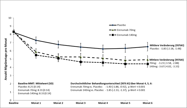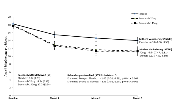 Es sind die Kleinstquadrat-Mittelwerte und die 95%-Konfidenzintervalle angegeben.Der p-Wert für die Differenz der Kleinstquadrat-Mittelwerte zwischen Erenumab und dem Placebo bei Beurteilung in Monat 3 (primäre Outcome-Variable) betrug <0,001.