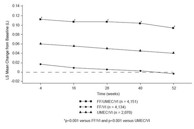 Die Wirkungen auf die Lungenfunktion, bezogen auf das Talspiegel-FEV1 (Änderung des Talspiegel-FEV1 gegenüber dem Ausgangswert), von FF/UMEC/VI im Vergleich zu FF/VI und UMEC/VI wurden zu allen Erhebungszeitpunkten im Verlauf der 52-wöchigen Studie beobachtet (siehe Abbildung 1).