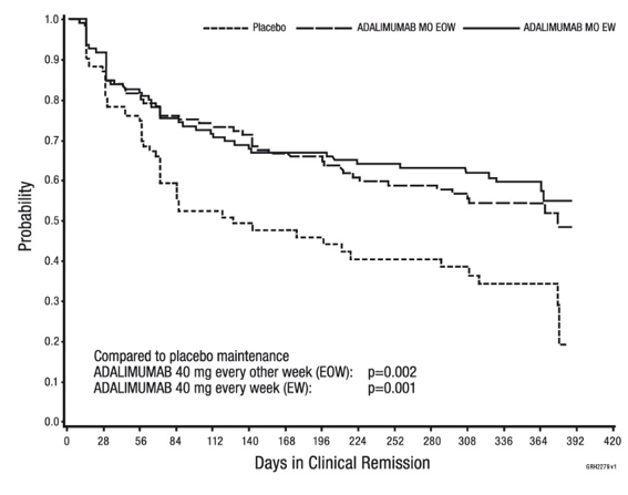 Kontrollierte Daten über eine Therapie mit Adalimumab im Vergleich zu Placebo liegen für eine Dauer von 52 Wochen vor. In einer Placebo-kontrollierten Vergleichsstudie mit Patienten, bei welchen unter einer Adalimumab-Therapie eine anhaltende Beschwerdefreiheit bis zur 33. Woche erzielt wurde, blieben unter Weiterführung mit Adalimumab 95,1% der Patienten bis zur 52. Woche rezidivfrei, unter Placebo (d.h. nach Absetzen von Adalimumab in der Woche 33) 71,6%.