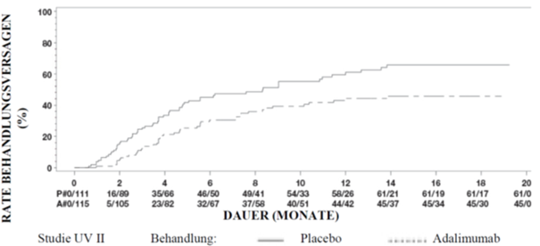 Die Ergebnisse beider Studien zeigten bei den mit Adalimumab behandelten Patienten eine statistisch signifikant längere Zeit bis zum ersten Therapieversagen als bei den mit Placebo behandelten Patienten (siehe Tabelle 17). Ebenso zeigten beide Studien eine frühe und anhaltende Wirkung von Adalimumab in Bezug auf die Verzögerung des ersten Therapieversagens gegenüber Placebo (siehe Abbildung 3).