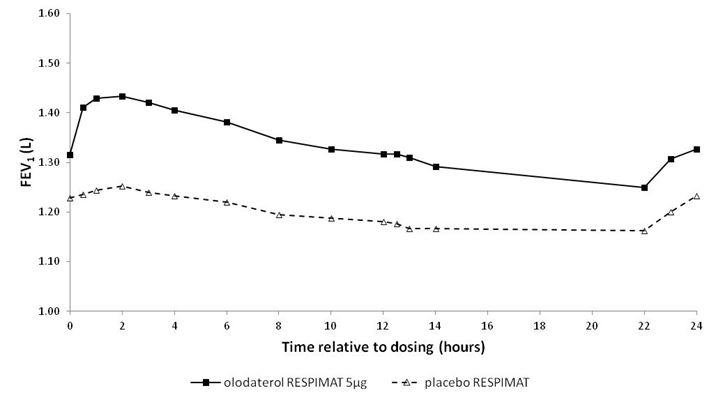 In den 6-wöchigen Studien sprachen die FEV1-Werte der mit Striverdi Respimat behandelten Patienten während des gesamten 24-stündigen Dosierungsintervalls signifikant stärker auf die Behandlung an als die Werte der Patienten unter Placebo (p<0,0001) (Abbildung 1, Abbildung 2, Tabelle 1).