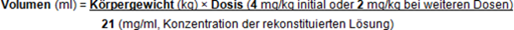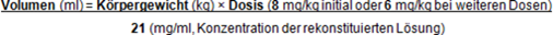 Das für die Behandlung des betroffenen Patienten erforderliche Volumen der rekonstituierten Lösung wird folgendermassen bestimmt: