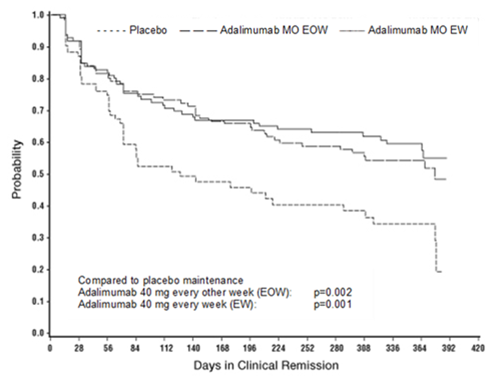 Die Ergebnisse beider Studien zeigten bei den mit Adalimumab behandelten Patienten eine statistisch signifikant längere Zeit bis zum ersten Therapieversagen als bei den mit Placebo behandelten Patienten (siehe Tabelle 17). Ebenso zeigten beide Studien eine frühe und anhaltende Wirkung von Adalimumab in Bezug auf die Verzögerung des ersten Therapieversagens gegenüber Placebo (siehe Abbildung 3).
