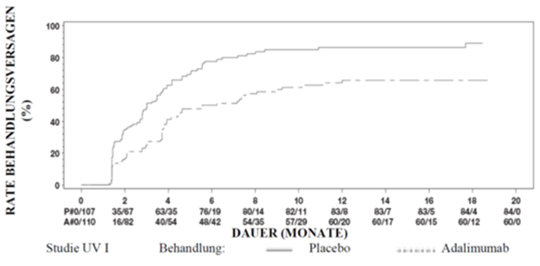 Eine Sensitivitätsanalyse des primären Endpunktes, in welcher Patienten, die vorzeitig abbrachen und solche, die unerlaubterweise Kortikosteroide als Begleitmedikation nahmen, als Behandlungsversager gezählt wurden, zeigte einen starken Behandlungseffekt zugunsten von Adalimumab (UV I: HR=0.66, 95%CI 0.48–0.88, p=0.005; UV II: HR=0.59, 95%CI 0.42-0.81, p=0.001).