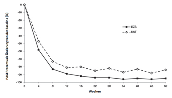 In einer kombinierten Analyse von Patienten, die innerhalb von ULTIMMA-1 und ULTIMMA-2 SKYRIZI erhielten und in Woche 16 ein PASI-100-Ansprechen zeigten, blieb das Ansprechen bei 79,8% (206/258) der mit SKYRIZI weiterbehandelten Patienten bis Woche 52 erhalten. 88,4% (398/450) der Patienten mit PASI-90-Ansprechen in Woche 16 zeigten bis Woche 52 ein anhaltendes Ansprechen.