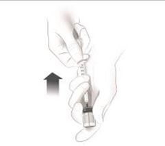 5.Neigen Sie die Durchstechflasche bis zu einem Winkel von etwa 45° und drehen Sie sie vorsichtig etwa 1 Minute lang zwischen den Fingerspitzen. Die Durchstechflasche nicht schütteln oder umdrehen.