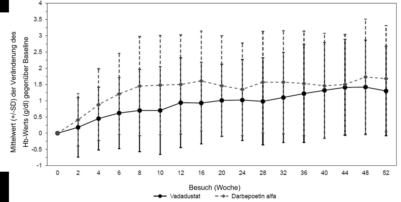 Es wurden zwei Studien (INNO2VATE 1 und INNO2VATE 2) mit erwachsenen dialysepflichtigen Patienten mit chronischer Nierenerkrankung mit Hb-Ausgangswerten von 8,0 bis 11,0 g/dl in den USA und 9,0 bis 12,0 g/dl ausserhalb der USA durchgeführt. An INNO2VATE 1 nahmen Patienten mit inzidenter dialysepflichtiger chronischer Nierenerkrankung teil, die innerhalb von 16 Wochen nach Beginn ihrer Studienteilnahme eine Dialysebehandlung aufnahmen und nicht mit ESA vorbehandelt waren, ESA zuvor nur in begrenztem Masse angewendet hatten oder ESA zur Erhaltungstherapie anwendeten. An INNO2VATE 2 nahmen Patienten teil, die seit mehr als 12 Wochen eine stabile Dialyse erhielten und von einer vorherigen ESA-Therapie auf Vadadustat umgestellt worden waren. In beiden Studien war Vadadustat Darbepoetin alfa im Hinblick auf die Korrektur und Aufrechterhaltung bzw. Aufrechterhaltung der Hb-Spiegel innerhalb regional spezifischer Hb-Zielbereiche (10,0 bis 11,0 g/dl in den USA und 10,0 bis 12,0 g/dl in Europa und dem Rest der Welt) in den Wochen 24 bis 36 und den Wochen 40 bis 52 bei erwachsenen dialysepflichtigen Patienten mit chronischer Nierenerkrankung und Anämie nicht unterlegen. Die Ergebnisse hinsichtlich der primären und sekundären Wirksamkeitsendpunkte sind in Tabelle 6 aufgeführt. Die Entwicklung des Hb-Werts während der Behandlung in einzelnen Studien ist in Abbildung 1 und Abbildung 2 gezeigt. Eine Untersuchung verschiedener Subgruppen, die nach Alter, Geschlecht, ethnischer Abstammung und Region gebildet wurden, ergab in diesen Subgruppen keine Unterschiede beim Ansprechen auf Vadadustat.