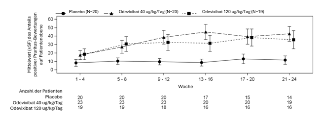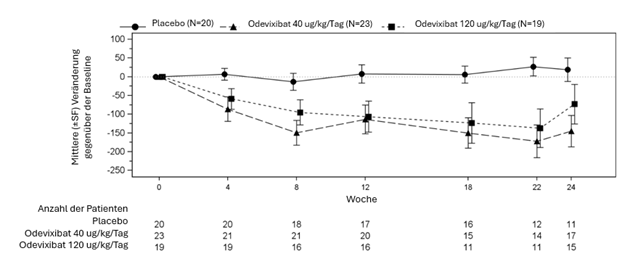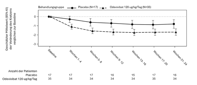 Tabelle 4 zeigt die Ergebnisse des Vergleichs der wichtigsten Wirksamkeitsdaten in PFIC-Studie 1 zwischen Odevixibat und Placebo. Die Daten bezüglich des Pruritus und des Gallensäurespiegels im Serum sind über die 24-wöchige Behandlungsdauer grafisch in Abbildung 1 (Anteil der Pruritus Bewertungen mit Ergebnissen von 0 oder 1) und in Abbildung 2 (mittlere Veränderung der Gallensäurekonzentration im Serum verglichen zur Baseline) dargestellt.