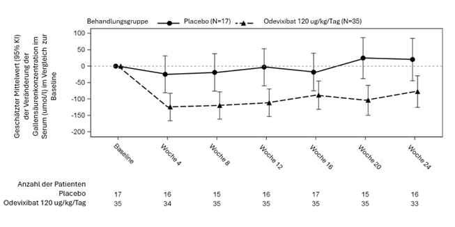 Als wichtigster sekundärer Endpunkt diente die Veränderung des Gallensäurespiegels im Serum zwischen der Baseline und dem Durchschnitt in den Wochen 20 und 24.