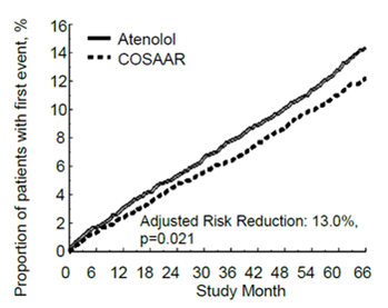 Der primäre Endpunkt war die Kombination von kardiovaskulärer Morbidität und Mortalität gemessen als Reduktion der kombinierten Ereignisse kardiovaskulärer Tod, Schlaganfall und Myokardinfarkt. Die Ergebnisse zeigten, dass die Behandlung mit Losartan im Vergleich zu Atenolol zu einer Risikoreduktion von 13,0 % (p=0,021) in Bezug auf den primären zusammengesetzten Endpunkt führte (siehe Graphik 1).