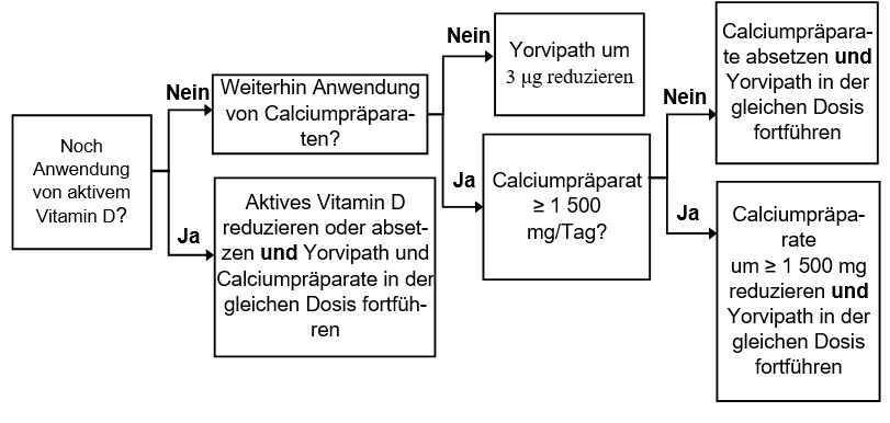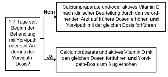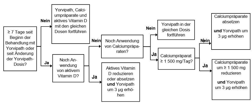 Nach jeder nachfolgenden Änderung der Dosis von Yorvipath, aktivem Vitamin D oder Calciumpräparaten soll der Patient auf klinische Symptome einer Hypocalciämie oder Hypercalciämie überwacht werden. Innerhalb von 7-14 Tagen nach der Dosisanpassung soll ausserdem das Serumcalcium bestimmt werden. Ggf. muss die Dosis von Yorvipath, aktivem Vitamin D und/oder Calciumpräparaten erneut entsprechend Abbildung 1 angepasst werden. Änderungen der Dosis von Yorvipath, aktivem Vitamin D oder Calciumpräparaten sind jeweils am gleichen Tag vorzunehmen.