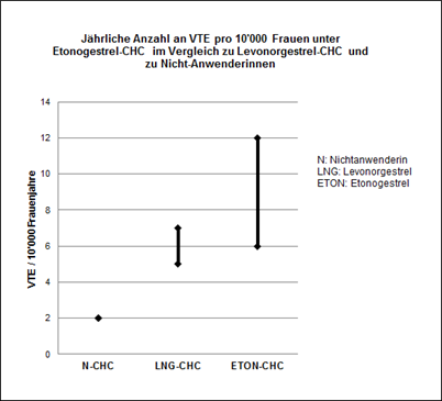 Warnhinweise und VorsichtsmassnahmenDie Anwendung eines CHC erhöht das Risiko für venöse Thromboembolien (VTE) und für arterielle Thromboembolien (ATE) im Vergleich zur Nichtanwendung. Warnhinweise und Vorsichtsmassnahmen, welche nachfolgend beschrieben werden, müssen vor jeder Verschreibung berücksichtigt werden (siehe «Risiko für venöse Thromboembolien [VTE]» und «Risiko für arterielle Thromboembolien [ATE]»). Es ist wichtig, die Patientin auf die Informationen zu venösen und arteriellen thromboembolischen Ereignissen hinzuweisen, insbesondere auf die möglichen Symptome von VTE und ATE und die bekannten vaskulären Risikofaktoren sowie darauf, was im Falle einer vermuteten Thrombose zu tun ist (siehe «Symptome einer VTE [tiefe Venenthrombose und Lungenembolie]» und «Symptome einer ATE»).