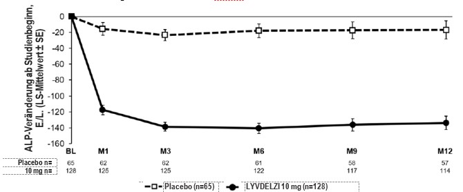 Abbildung 1 zeigt die mittleren ALP-Verringerungen bei mit Lyvdelzi behandelten Patienten im Vergleich zu Placebo über 12 Monate. Verringerungen wurden in Monat 1 beobachtet, setzten sich bis Monat 6 fort und hielten bis Monat 12 an. Die mittlere Veränderung (SE) der kleinsten Quadrate (LS) gegenüber dem Ausgangswert der ALP in Monat 12 betrug in der Gruppe mit Lyvdelzi 10 mg -134 (-151, -117) E/l und in der Placebo-Gruppe -17 (-40, 6) E/l.