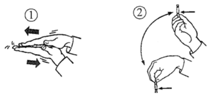Zuerst wird die Patrone 10 mal zwischen den Handflächen gerollt, dann 10 mal gekippt (180°-Winkel) - siehe Abbildungen 1 und 2.