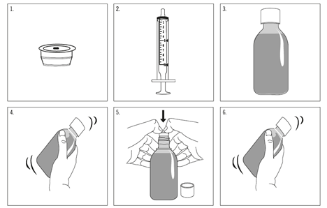 Zubereitung einer Einzeldosis: Die Suspension kann direkt aus der Applikationsspritze geschluckt oder in einem kleinen Glas Wasser aufgerührt werden.